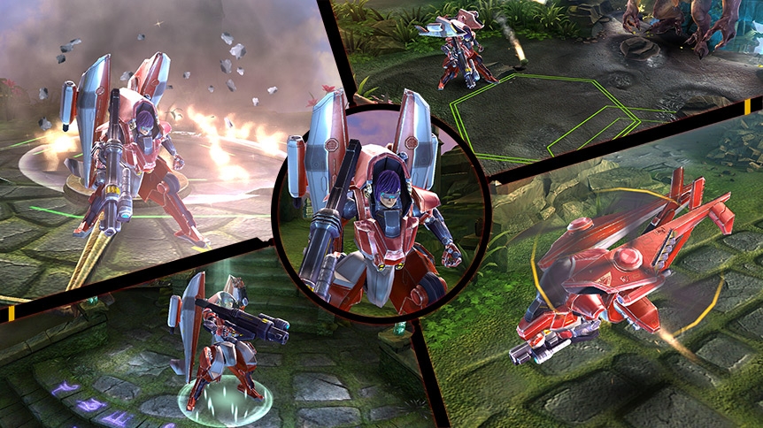 Redesigned cherry-red mech with helicopter nacelles